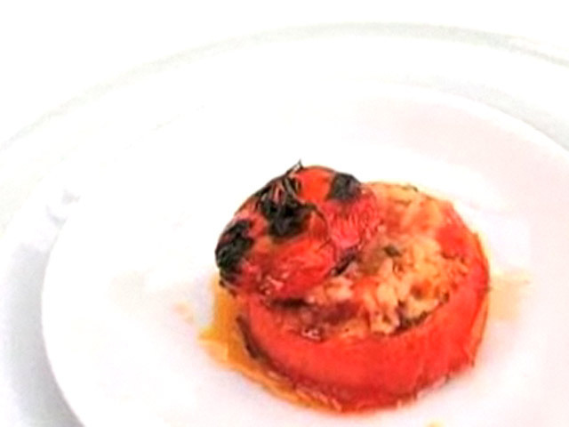Фаршированные помидоры с рисом и базиликом. Итальянская кухня.На 3 порции:помидоры — 3 штуки;базилик — 1 пучок;рис — 3 столовых ложки;сахар — 1 столовая ложка;орегано, оливковое масло, соль, черный перец. Язык: Русский