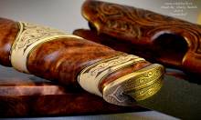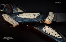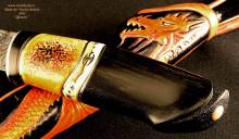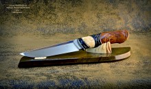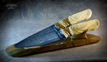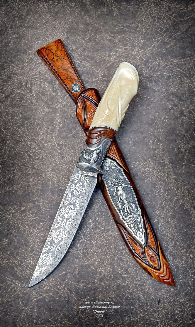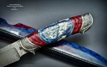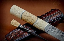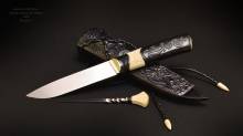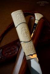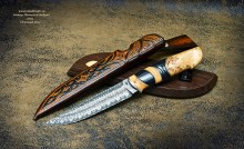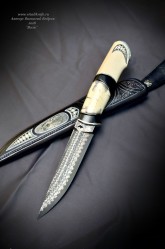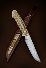 Все ножи сделаны в единственном экземпляре и обладают неповторимой харизмой. Ножны и подставки изготовлены индивидуально под каждый нож и объединены одним смыслом и стилем с ним. При изготовлении ножей используются самые элитные и экзотические материалы для ножей, такие как: бивень мамонта, клык моржа, рог буйвола, зуб кашалота, мозаичный дамаск, булат, редкие сорта древесины, кожи и пр...